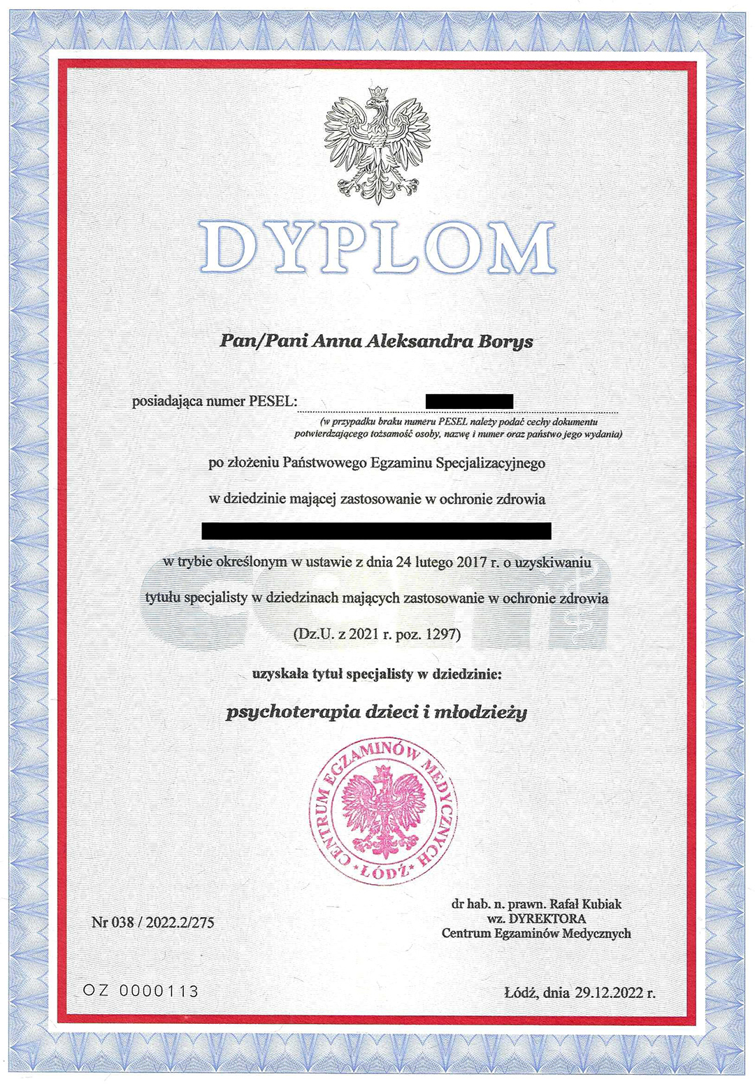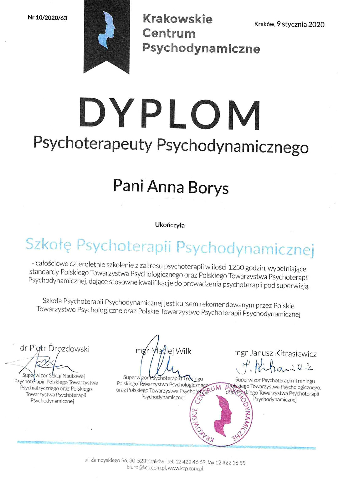 Z wykształcenia jestem psychologiem. Ukończyłam Studium Socjoterapii i Treningu Interpersonalnego oraz Szkołę Psychoterapii Psychodynamicznej [dyplom ukończenia] (całościowe czteroletnie szkolenie psychoterapeutyczne rekomendowane przez Polskie Towarzystwo Psychologiczne) w Krakowskim Centrum Psychodynamicznym. W 2022 roku zdałam Państwowy Egzamin Specjalizacyjny [dyplom ukończenia] uzyskując tytuł specjalisty psychoterapii dzieci i młodzieży (nr 038/2022.2/275)